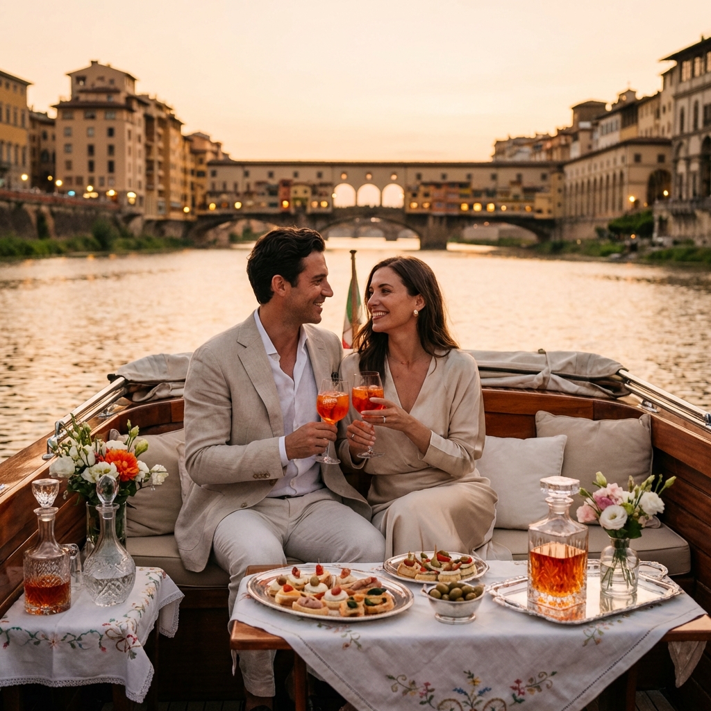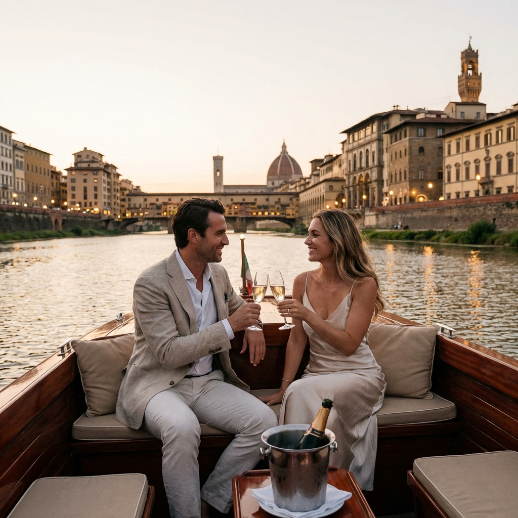 For the most romantic marriage proposal florence Italy can offer, imagine drifting beneath the Ponte Vecchio as golden light spills across ancient stone, your beloved beside you on a private vessel adorned with fresh flowers. This is Secrets of the Arno — an exclusive two-hour journey along Florence’s legendary river, where Renaissance beauty becomes the backdrop for your declaration of forever. With thirty years of crafting perfect proposals across Italy, Kiss Me Italy transforms this iconic waterway into your personal stage. As the historic palazzi reflect upon the water’s surface and champagne bubbles rise in crystal flutes, you’ll understand why Florence has inspired lovers for centuries. This is not merely a boat ride — it is a carefully orchestrated moment of pure romance, designed for the man who refuses to settle for ordinary.