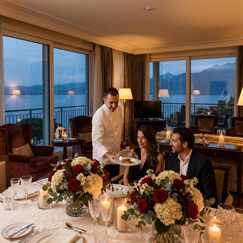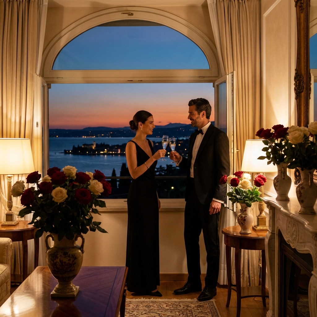 Your marriage proposal Lake Garda Italy begins as the sun descends over one of Europe’s most breathtaking natural amphitheatres. A private boat glides you through the iconic landscapes of this legendary lake—dramatic cliffs softened by cypress groves, medieval villages glowing in amber light, and waters that shimmer like liquid gold. As twilight falls, you arrive at an exclusive suite where champagne awaits, the prelude to an evening of extraordinary intimacy. Kiss Me Italy has spent 30 years perfecting these moments, understanding that a proposal is not merely a question asked, but a story written in time. Your private chef presents an elegant dinner served within the sanctuary of your suite, surrounded by dedicated floral arrangements and a scenic setup designed to frame the single most important word of your lives together. The night unfolds into morning, where a chef-prepared breakfast greets you as the lake awakens—a gentle reminder that this is merely the first chapter of forever.