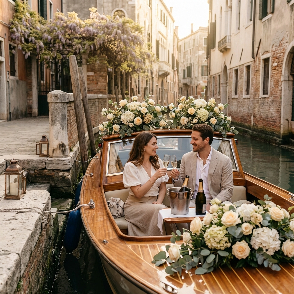 A marriage proposal Venice Italy experience unlike any other awaits as you drift through the city’s most iconic waterways aboard your own private vessel. This is Venice as few ever witness her — hidden corners where ancient palaces lean towards still waters, secret passages that have sheltered lovers for centuries, and light that seems to exist nowhere else on earth. Your boat arrives dressed in an artful arrangement of seasonal blooms, whilst a carefully selected aperitivo and champagne toast set the scene for the question that will change everything. With Kiss Me Italy’s 30 years of proposal expertise guiding every detail, you need only focus on the moment she says yes.